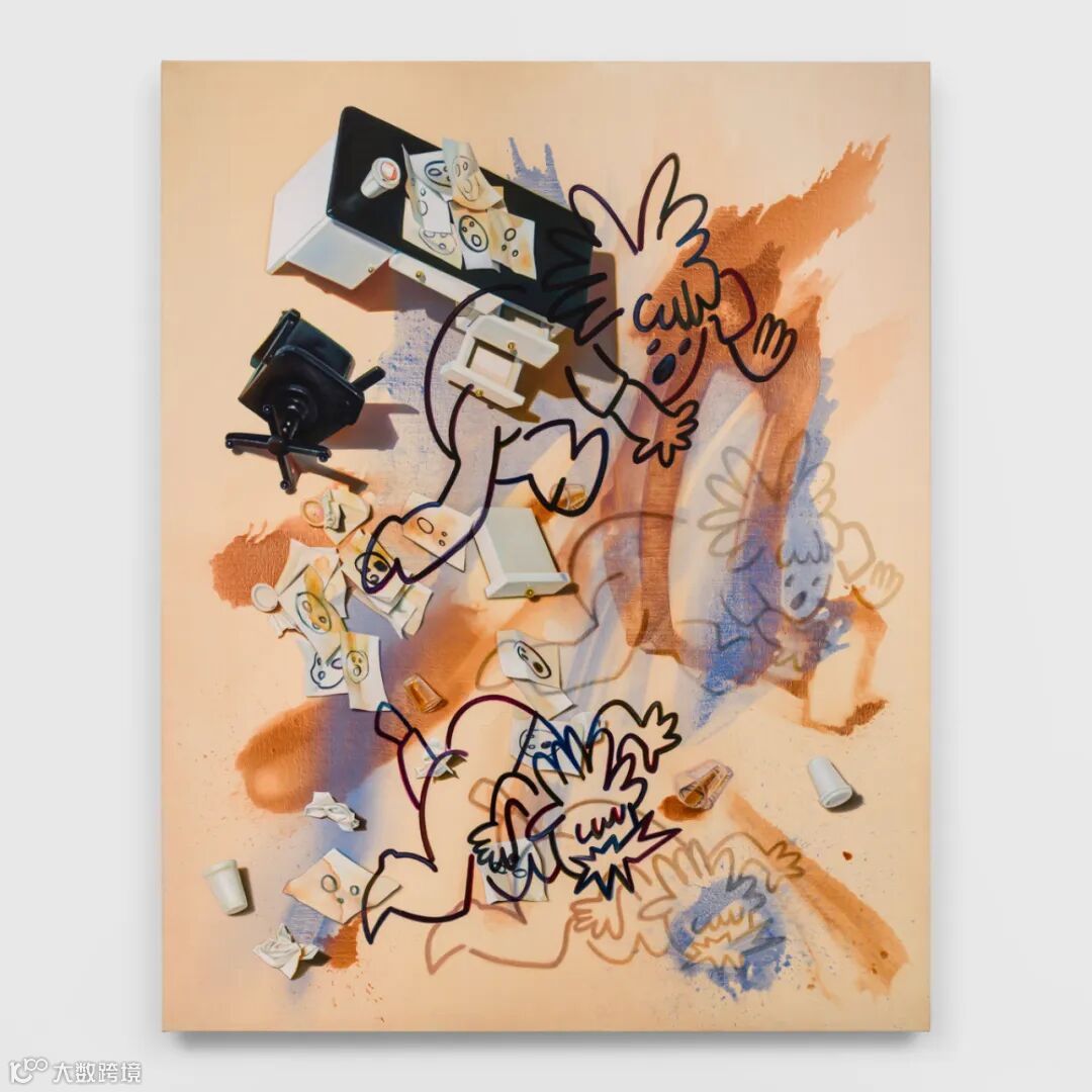 以其独特的视觉语汇,萨特洛夫斯基延续了艺术史中的超现实主义谱系,回应社会与政治动荡及技术变迁如何塑造知觉与情感。她的绘画折射出当代世界特有的荒诞。作品《办公室坠落者》(Fallers Office,2025)与《办公室倾覆》(Office Dumpo,2025)描绘了一个卡通化人物面朝地板摔倒的涂鸦式形象,周遭是被掀翻的办公家具、飞舞的纸张与泼洒的饮料。画面将多重视角、时间与图像生成的不同层级并置在一起,指向彻底的断裂与失序。