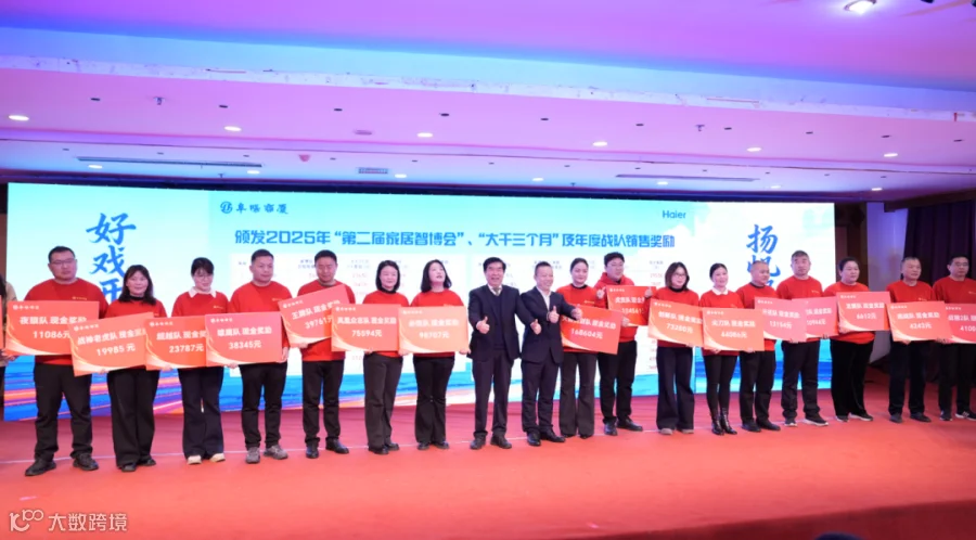 大会同步颁发2025年“第二届家居智博会”“大干三个月”及年度战队销售奖励。刘震、高冲、张慧影、任丽娟、袁梦佳等百万元大户代表获颁旅游奖励,现场掌声雷动。