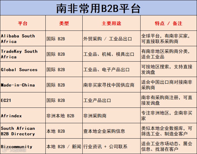B2B平台跟黄页一样,上面也是可以找到大量的南非本土企业信息,而且有些还可以免费发布产品,有时间的话也是可以研究一下的。