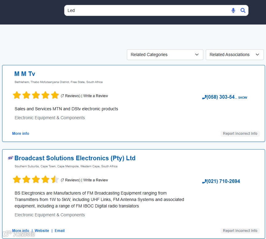 一个南非常见的网页搜索网站,用产品关键词搜索,可以查看到电话等等信息,搜索的数据量还算可以。