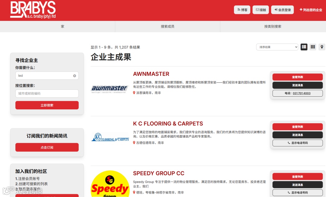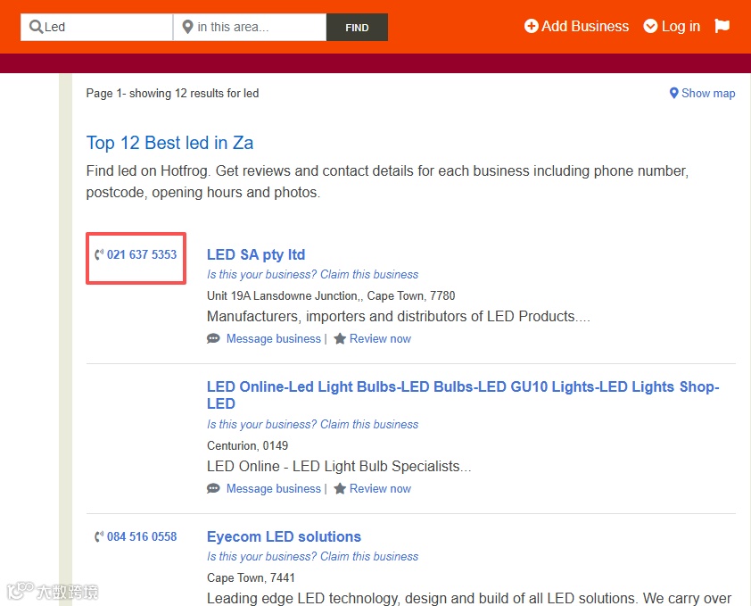 这个是南非非常常用的黄页网站,收录了大概30万家的南非本土企业,直接用产品关键词搜索即可,可以看到客户的公司名字以及电话相关信息。