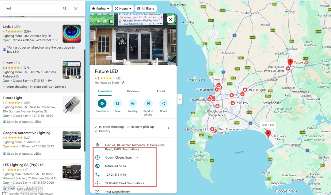 谷歌地图是南非最常用的地图开发系统,收录的信息也非得齐全,可以直接看到客户的公司名字、网站、电话以及邮箱相关信息,非常的推荐。