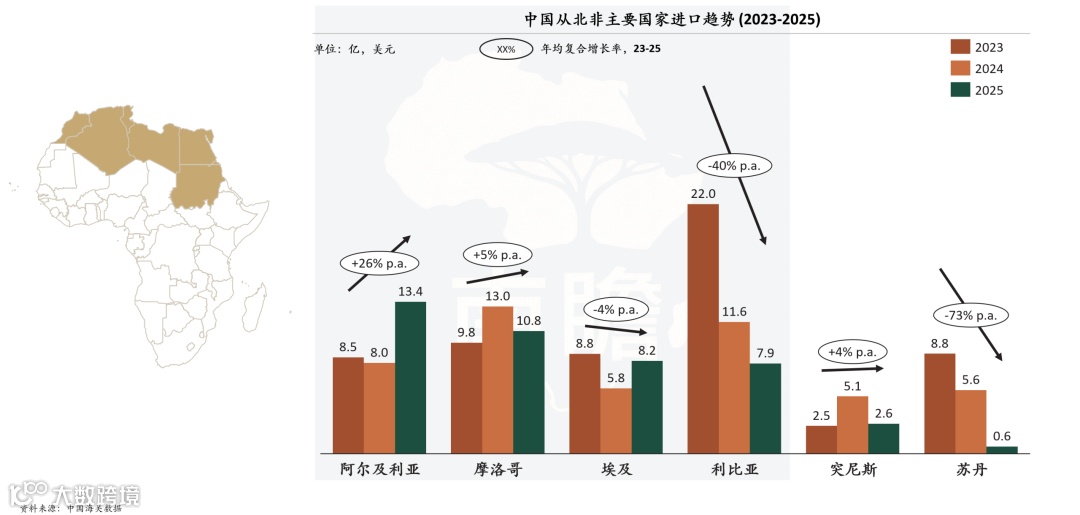 中国从北非主要国家进口趋势(2023–2025)