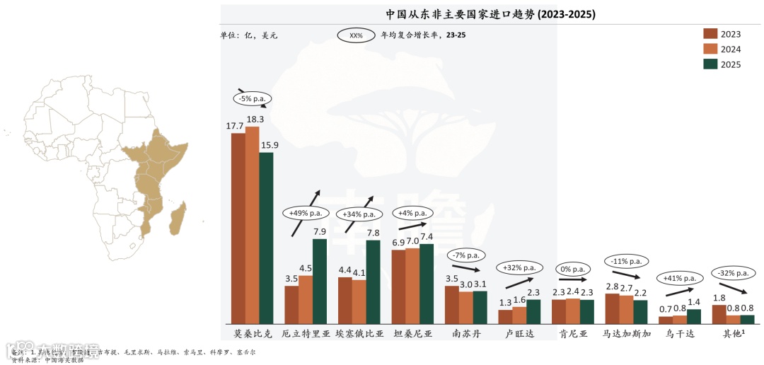 中国从东非主要国家进口趋势(2023–2025)