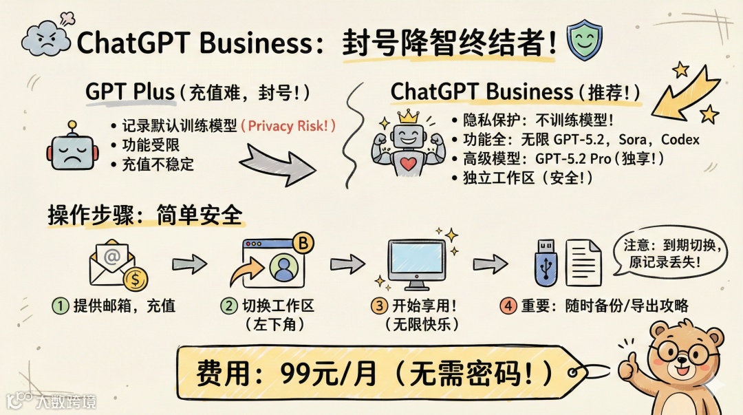 当前,ChatGPT Plus 用户普遍面临充值困难、账号异常封禁及模型响应降质等问题。为此,我们推荐官方推出的 ChatGPT Business 方案——兼顾隐私保护、功能完整性与使用稳定性。