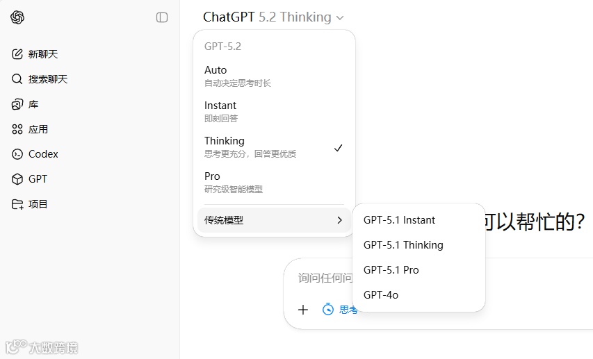 - 功能全面升级:支持无限次 GPT-5.2 消息调用、多种 thinking 模式、Codex 与 Sora 工具集成、专属 GPT-5.2 Pro 高级模型(Plus 不提供),并配备独立工作区。