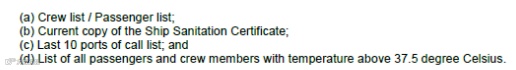 海事健康申报单(MDH,模板见Annex B); 船员及乘客名单; 现行有效的船舶卫生证书副本; 船舶最近10个挂靠港口清单; 船上所有体温超过37.5℃的船员及乘客名单。
