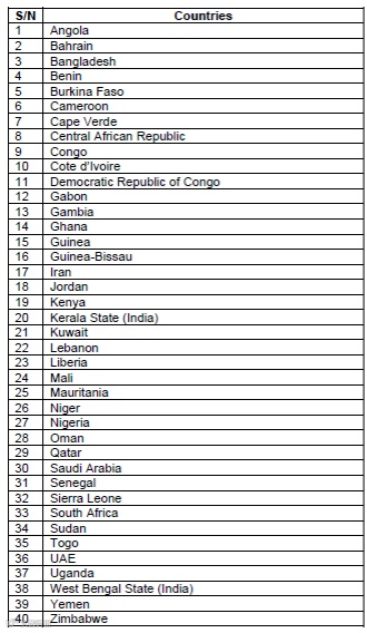 共40个,含印度喀拉拉邦、西孟加拉邦两个邦级行政区,其余为非洲、亚洲(中东、南亚等)主权国家,如安哥拉、伊朗、阿联酋等。
