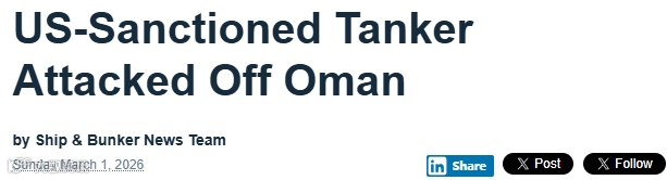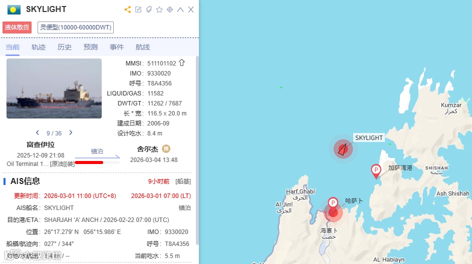 据航运媒体ShipBunker 3月1日报道,一艘未经授权通过霍尔木兹海峡的油轮“SKYLIGHT”号在阿曼穆桑代姆省哈萨卜港以北5海里处遭袭击,船体严重受损,目前正沉没。