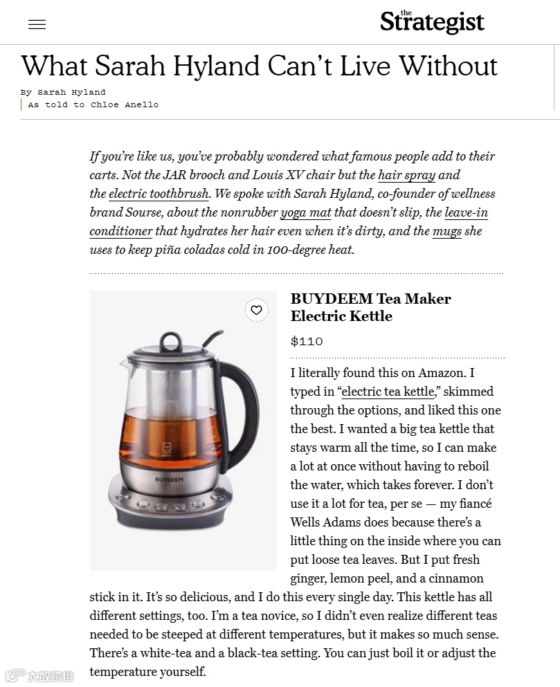 《摩登家庭》主演Sarah Hyland在接受《The Strategist》(《纽约杂志》旗下购物指南)采访时,将Buydeem养生壶列为“生活中不可或缺的物品”,并透露其在亚马逊偶然购得后迅速成为家庭高频使用产品。明星自发推荐带来远超硬广的信任效应。
