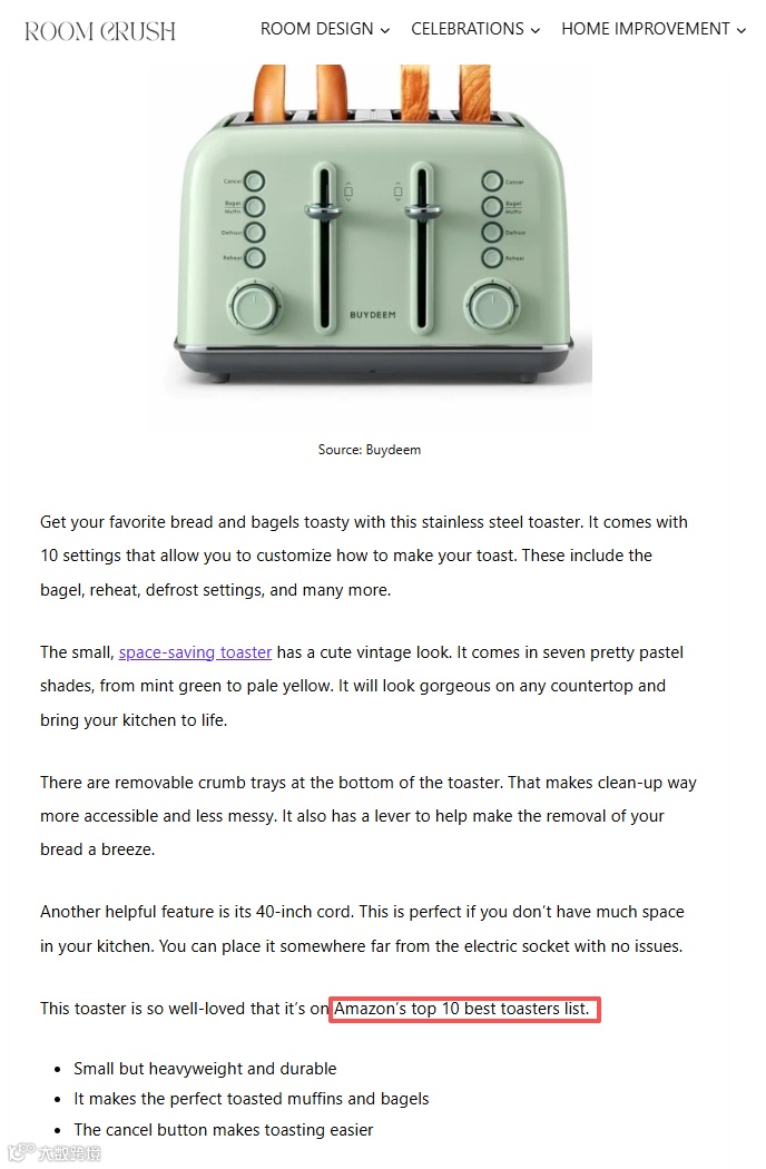 Buydeem通过Yahoo Finance发布新品新闻稿,依托其超1亿月活用户基础,强化“国际品牌”形象;同时联合生活方式垂类媒体Room Crush开展深度评测,覆盖电蒸锅、多士炉、手冲咖啡套装及养生壶等全系产品,并入选“亚马逊十大最佳烤面包机”榜单。
