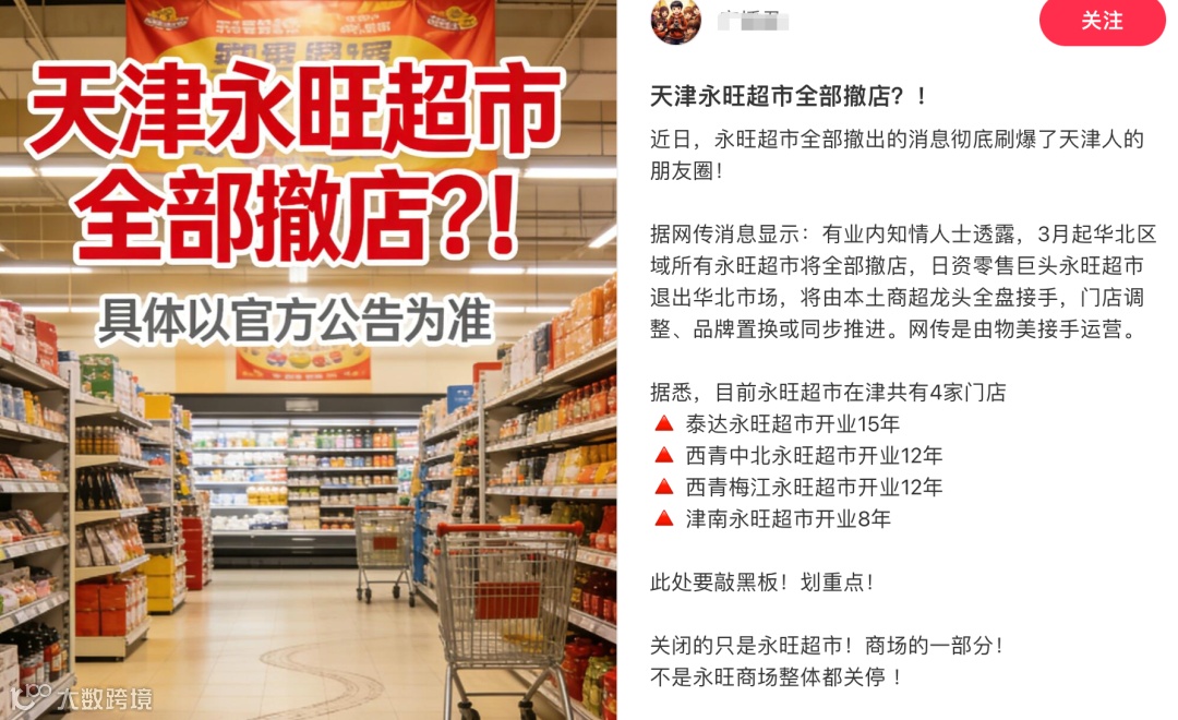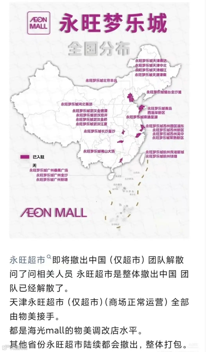 近日,社交平台流传“3月起华北区域所有永旺超市将全部撤店”“永旺整体撤出中国市场”等消息,并称物美将接手运营。对此,永旺中国官方明确回应:相关传言为不实信息,永旺目前在中国所有门店均正常营业,无整体撤出计划。
