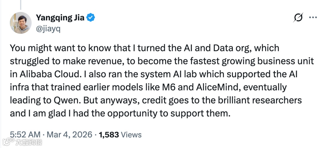 贾扬清同时澄清:其任内曾将长期难盈利的 AI 与数据部门带成阿里云增长最快业务单元,并运营系统 AI 实验室,为 M6、AliceMind 等早期项目提供底层算力与训练支持,为 Qwen 奠定重要基础。“真正的功劳属于那些才华横溢的研究人员。”