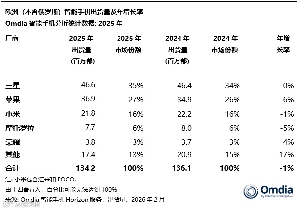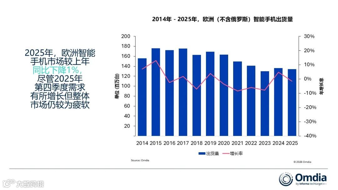 Omdia最新研究显示,2025年欧洲智能手机市场出货量下滑1%,至1.342亿部,受需求低迷、环保设计要求及USB-C强制新规等多重因素影响。