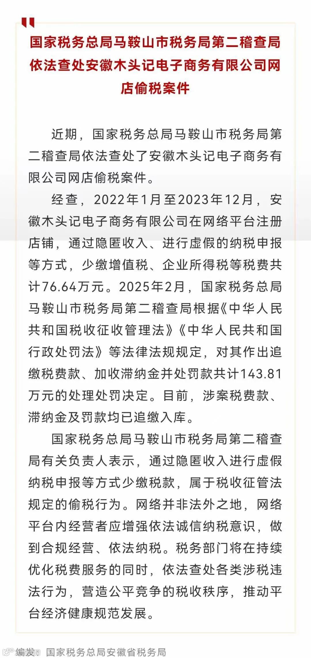 最近,国家税务总局马鞍山市税务局第二稽查局公布了一起典型的电商偷税案件,安徽木头记电子商务有限公司因隐匿网店收入、虚假申报,被依法追缴税款、加收滞纳金并处罚款,合计143.81万元,所有款项已经全部入库。这件事看起来只是一家中小电商的处罚通报,实则是给所有线上经营者敲了一记警钟:电商不是法外之地,个人账户收款、少报收入这套老套路,现在已经彻底走不通了。