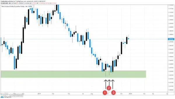 让我们看看上图NZDCAD的周线图,很明显,图中的点1和点2是过去价格行为中的主要反转点,绿色区域就是关键水平位。