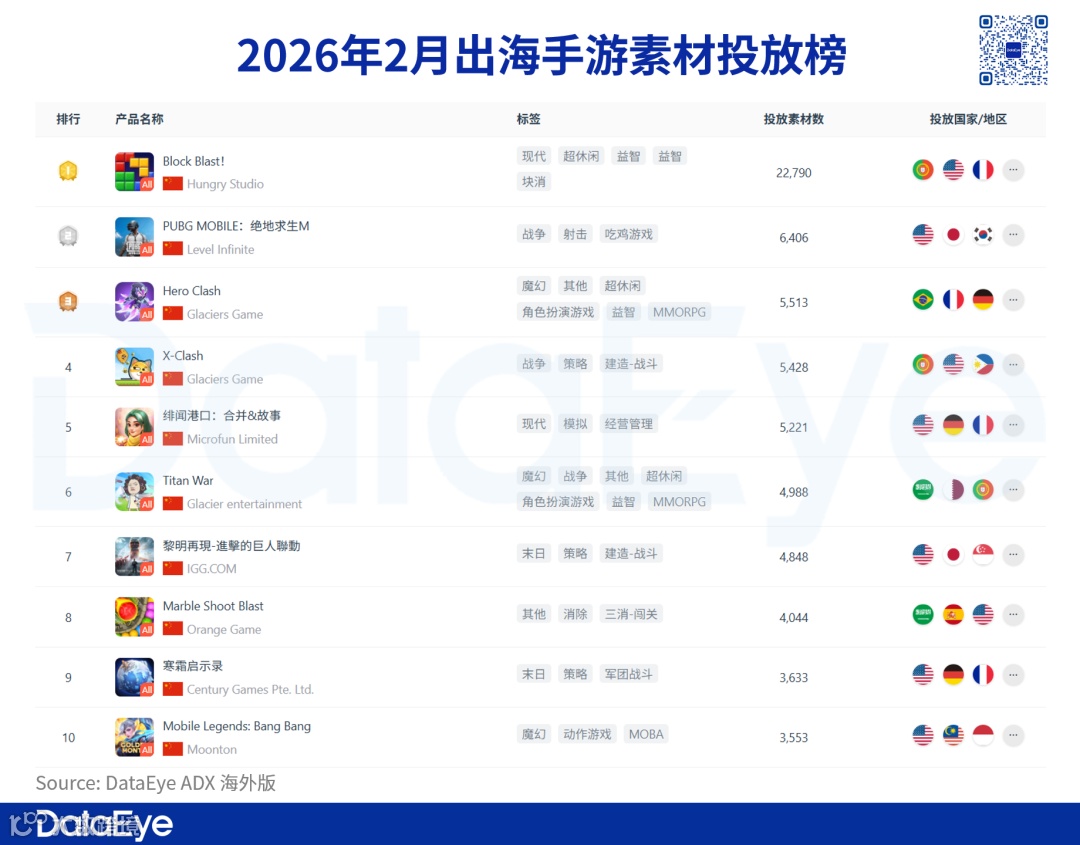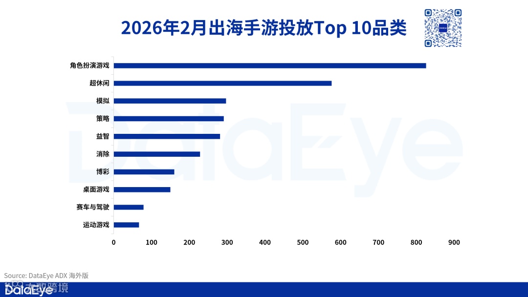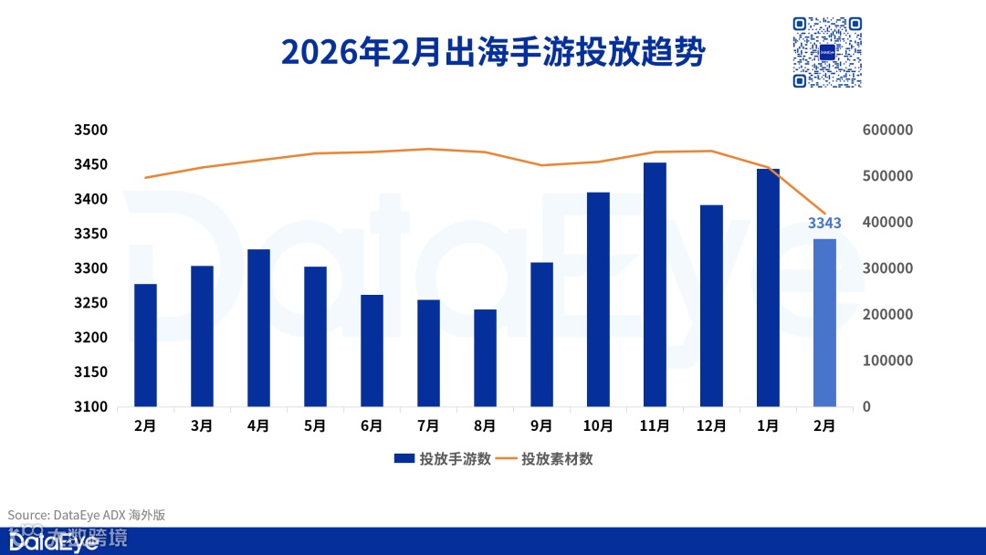 DataEye-ADX海外版数据显示,2026年2月中国大陆出海投放手游数为3343款,较1月的3444款小幅回落约2.9%;出海广告素材投放量为41.9万组,较1月的51.9万组环比下降约19.3%。