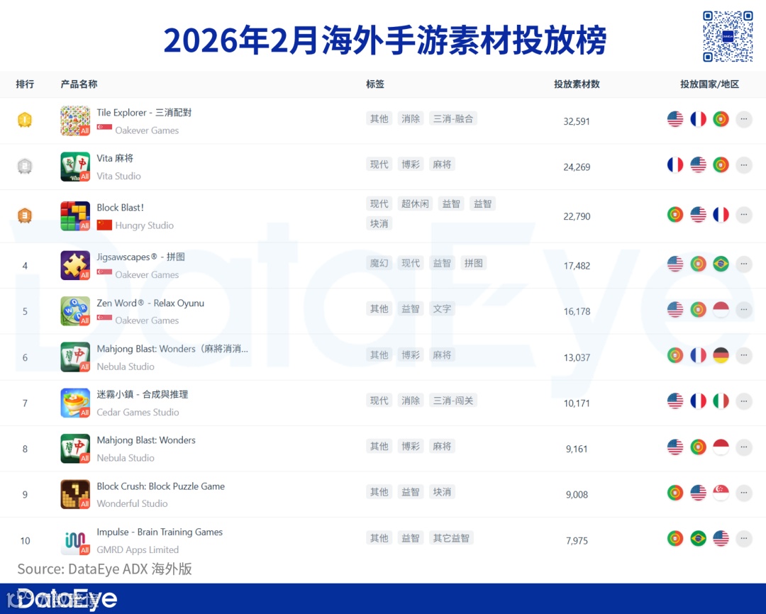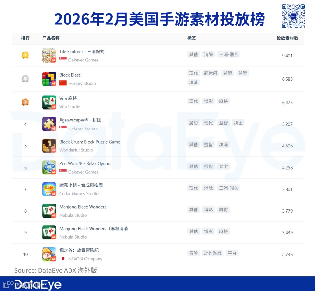 2026年2月美国手游素材投放榜继续呈现出高度休闲化特征。前10名中,超过7款产品为三消、拼图、麻将、字谜等轻度休闲品类。美国市场素材投放资源明显向“低成本、高ROI、强素材测试能力”的产品集中。
