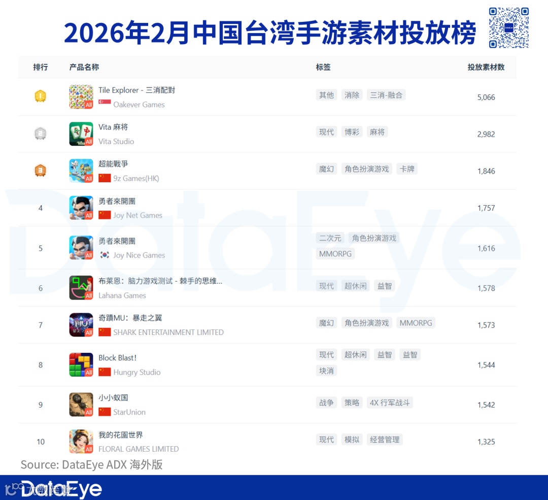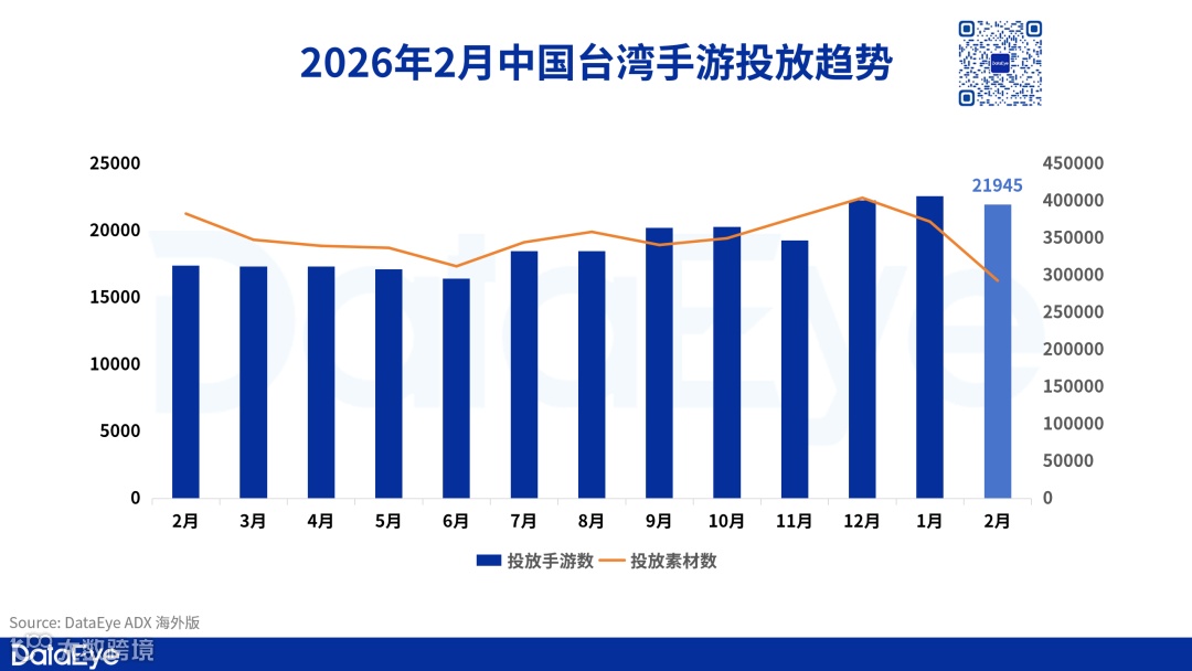 DataEye-ADX海外版数据显示,2026年2月中国台湾市场投放手游数为2.2万款,较1月的2.3万款小幅回落约2.7%;投放广告素材数为29.3万组,较1月的37.2万组环比下降约21.3%。