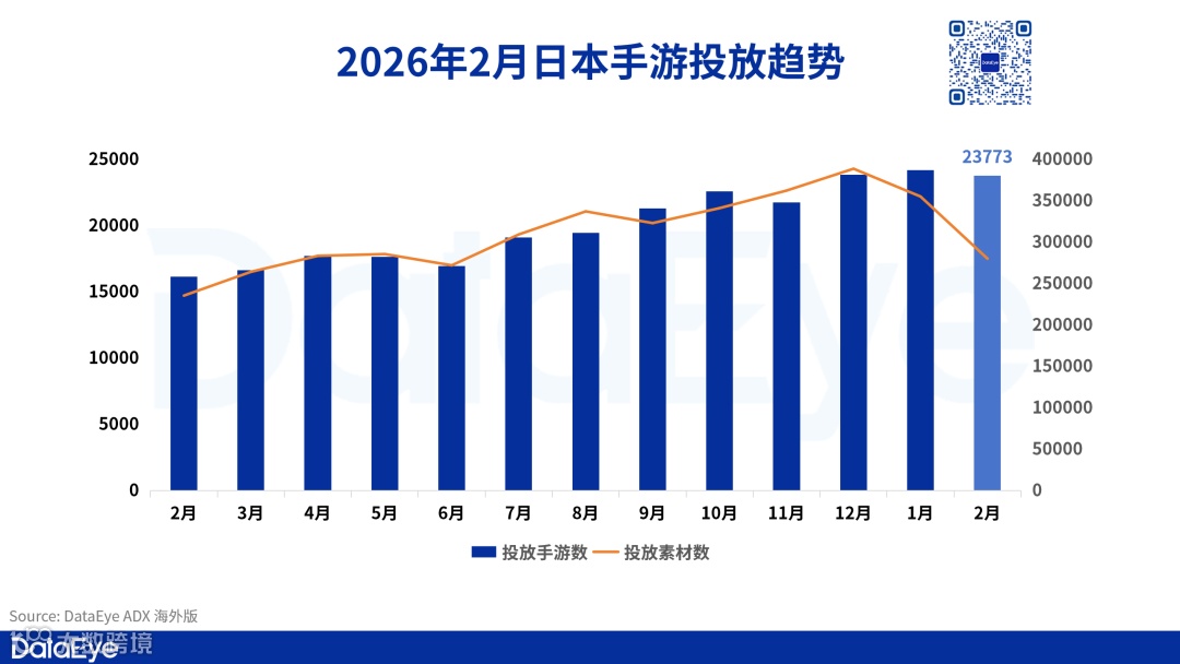 DataEye-ADX海外版数据显示,2026年2月日本市场投放手游数为2.3万款,较1月的2.4万款小幅回落约1.7%;投放广告素材数为28万组,环比下降约21.1%。