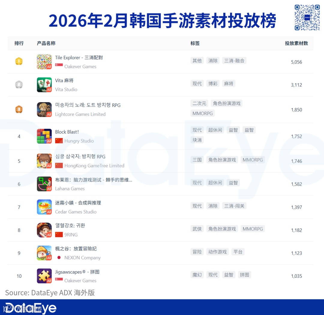 2026年2月韩国手游素材投放榜呈现出一个非常清晰的特征:轻度产品在头部,但RPG在中腰部密集分布。