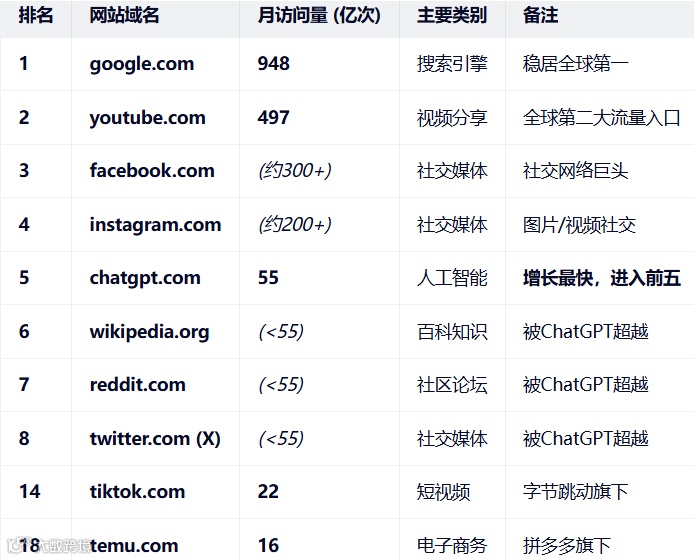 据Semrush最新数据,2026年1月ChatGPT月访问量达55亿次,跻身全球网站访问量前五,超越Reddit、维基百科和X(原Twitter)。自2022年底发布以来,仅用3年即达成此里程碑,印证AI已成长为继搜索引擎、社交媒体之后的第三大流量入口。