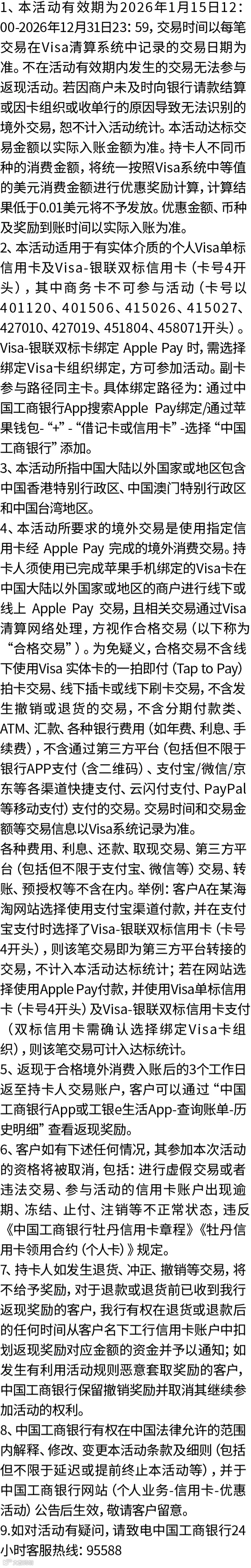 【消费返现】Apple Pay添加工银Visa信用卡,境外首笔交易最高返现2美元