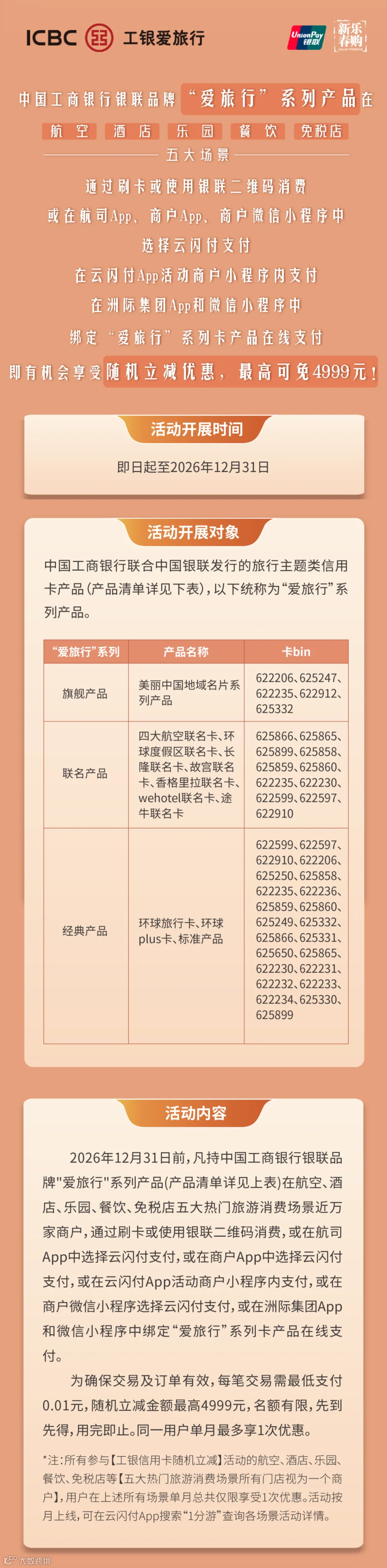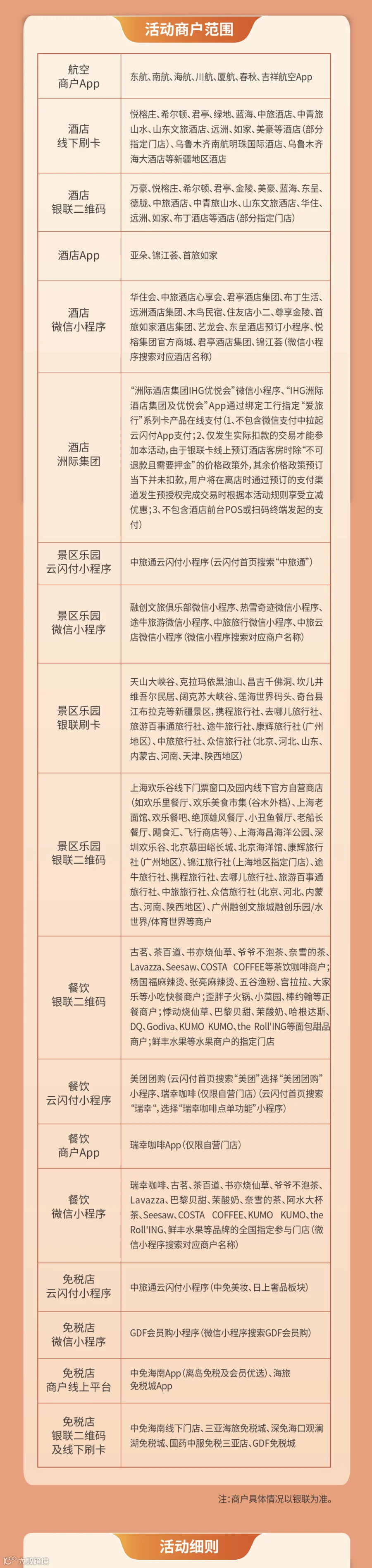 6. 仅限经银联转接的交易才能享受优惠。消费券、提货券、储值卡等储值类及烟酒类商品不参加活动。