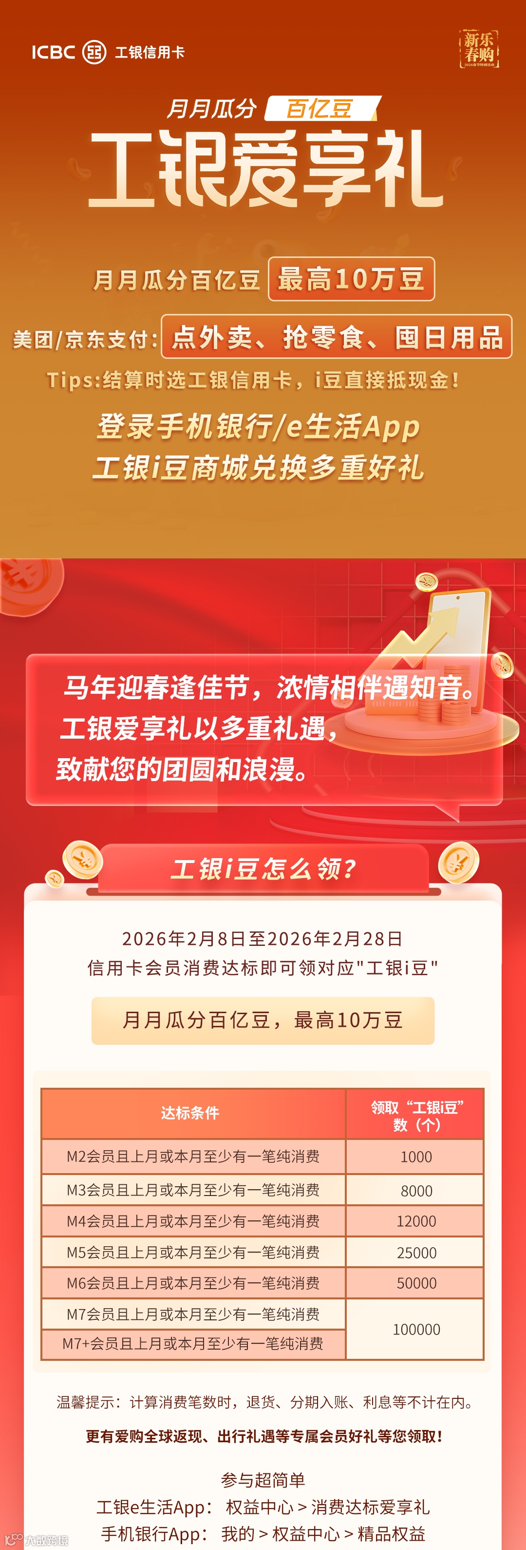 1.通过“工银爱享礼”活动领取的工银i豆有效期为1年。每年12月底到期的“工银i豆”具体到期日为12月30日,其他月份到期的“工银i豆”具体到期日为到期当月最后一日。例如,2025年6月发放的消费积分转换为“工银i豆”后,在2026年6月30日(含)之前有效。