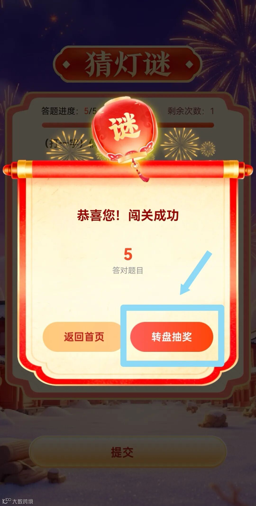 参与者进入活动主页面后,点击屏幕底部的“猜灯谜”进入答题界面,每次随机抽取5道题目,答对3道及以上即可进入转盘抽奖界面。