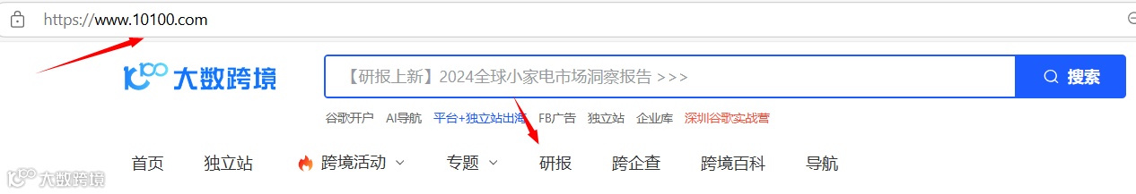 1. 打开大数跨境官网首页,选择“研报”。
