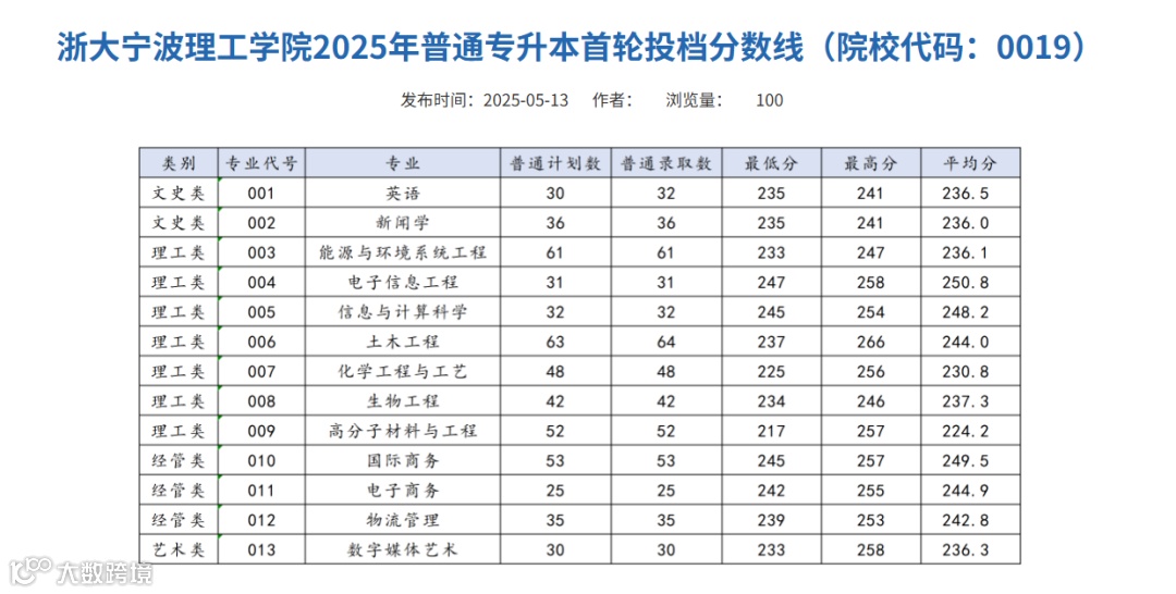 浙大宁波理工学院2025年专升本录取分数线