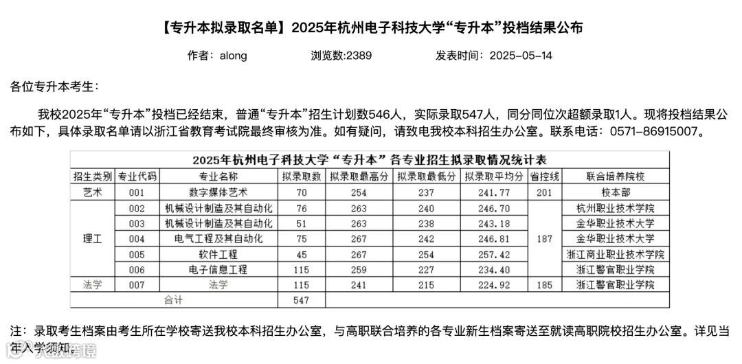 杭州电子科技大学2025年专升本录取分数线