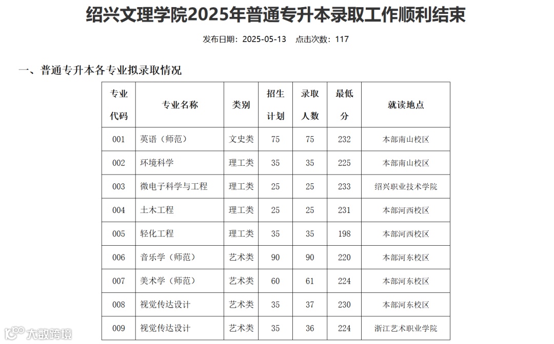 绍兴文理学院2025年专升本录取分数线