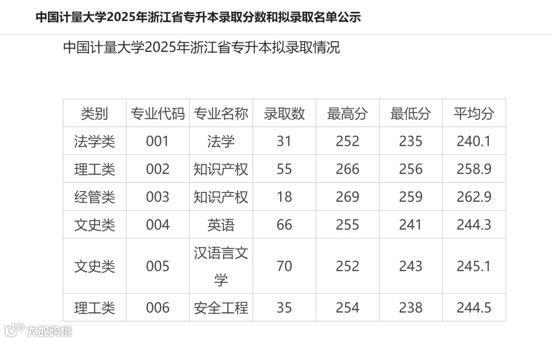 中国计量大学2025年专升本录取分数线