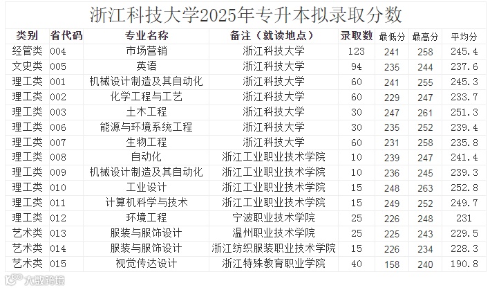 浙江科技大学2025年专升本录取分数线