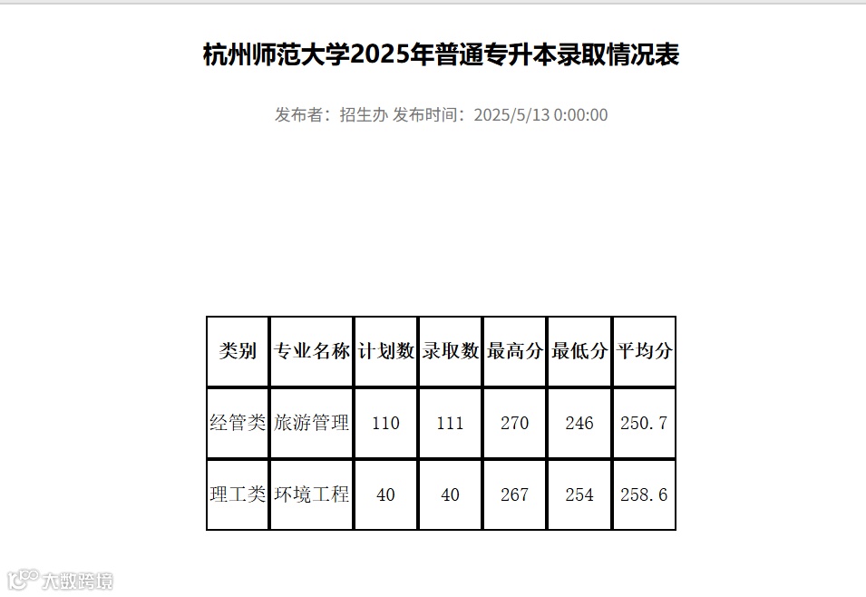 杭州师范大学2025年专升本录取分数线