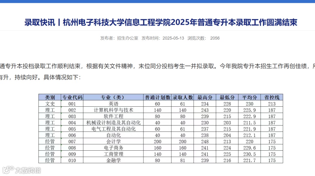 杭州电子科技大学信息工程学院2025年专升本录取分数线