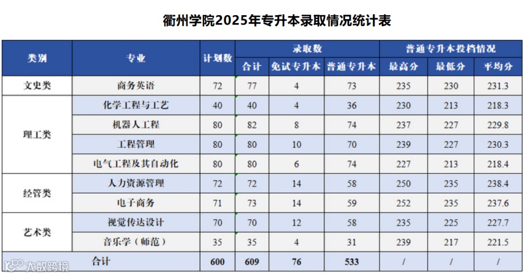 衢州学院2025年专升本录取分数线