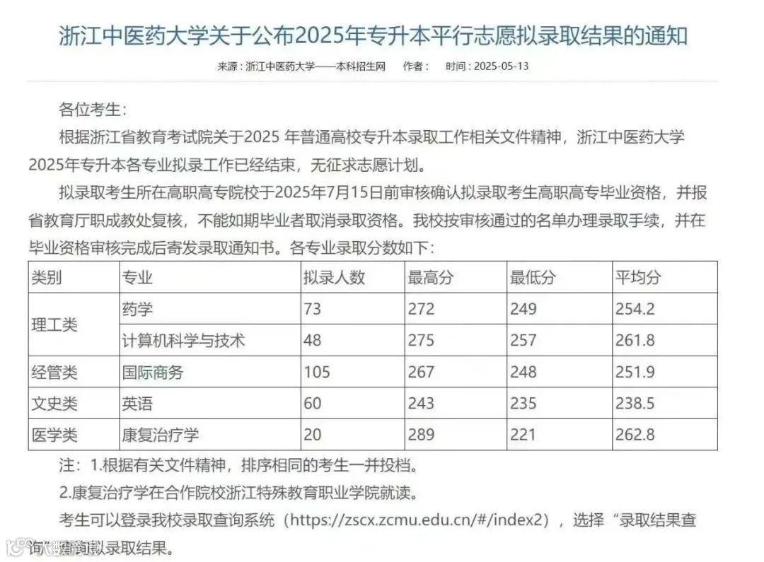 浙江中医药大学2025年专升本录取分数线