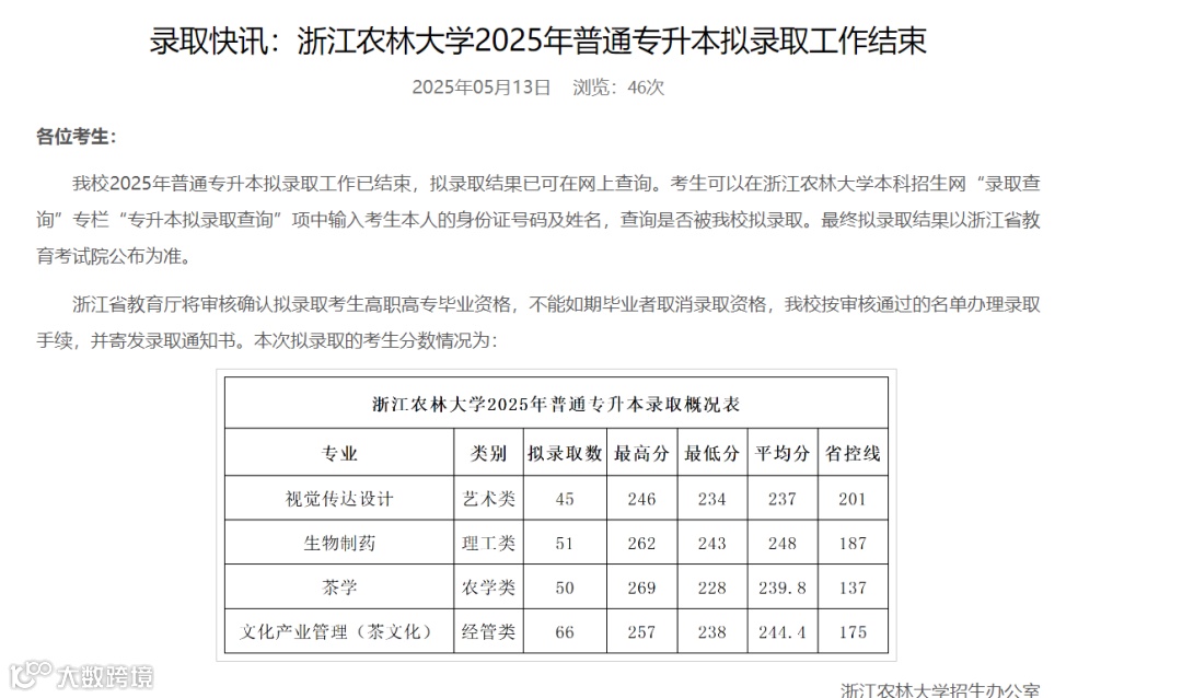 浙江农林大学2025年专升本录取分数线