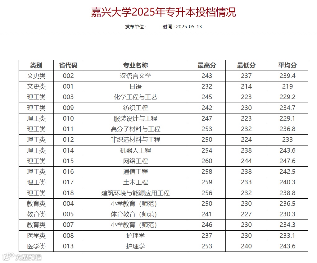 嘉兴大学2025年专升本录取分数线