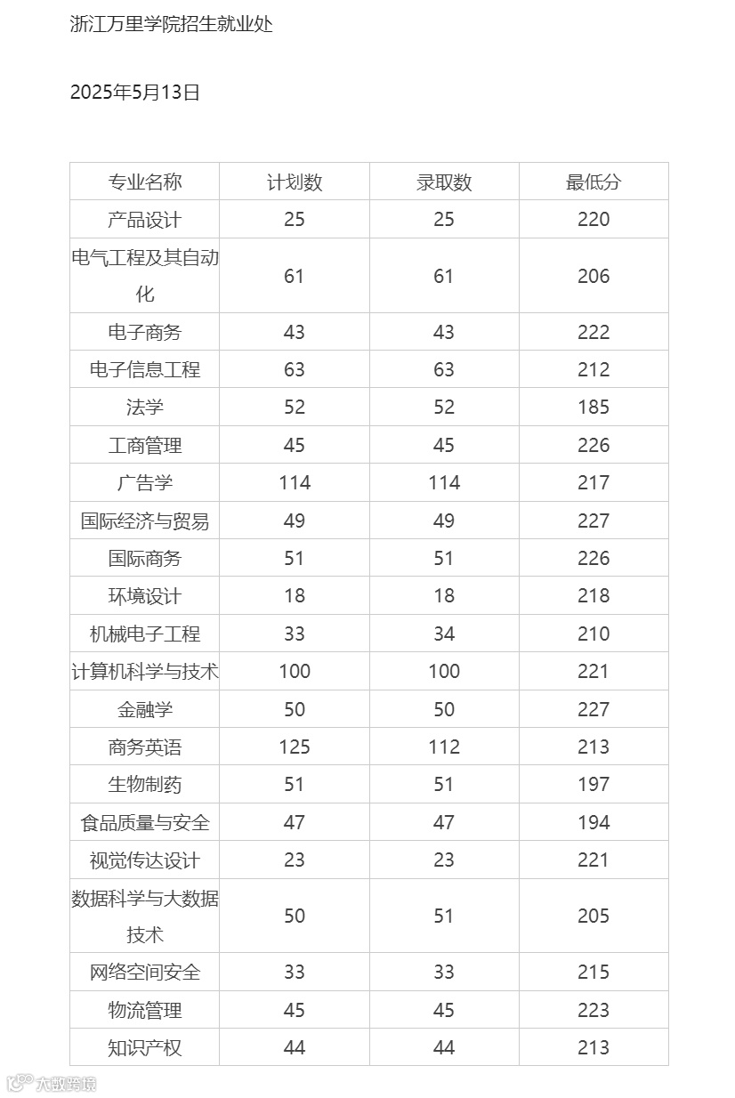浙江万里学院2025年专升本录取分数线