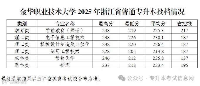 金华职业技术大学2025年专升本录取分数线