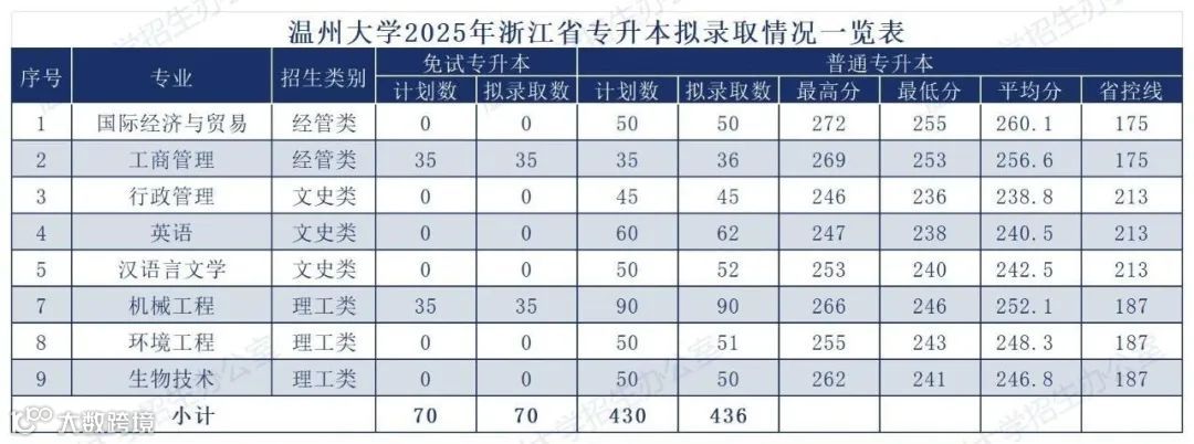 温州大学2025年专升本录取分数线