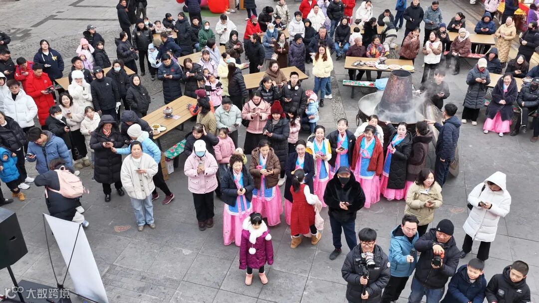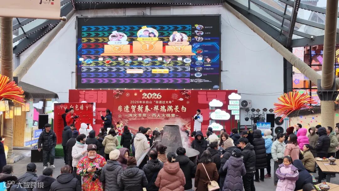 下午四点,在主持人的引导下,抽奖环节正式开始,来自全国各地的游客和本地居民纷纷拿出手机扫描屏幕二维码,通过摇一摇参与互动,中奖游客开心地上台领奖抽取红包。现场十余张大长桌依次排开,一具具锃亮的景泰蓝黄铜火锅被端上桌面,活动现场还特别设置了一口直径1.5米的超大型火锅,格外引人注目。炭火正红,老汤翻滚,酸菜与白肉的香气混合着松木清香,在凛冽的空气中弥漫开来。