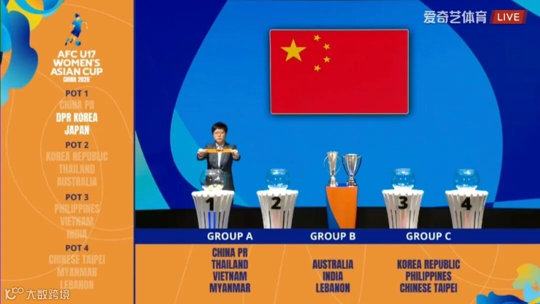 在首先揭晓的2026年亚足联女足U17亚洲杯抽签中,中国U17女足国家队以第一档种子队与泰国队、越南队、缅甸队同分在A组。
