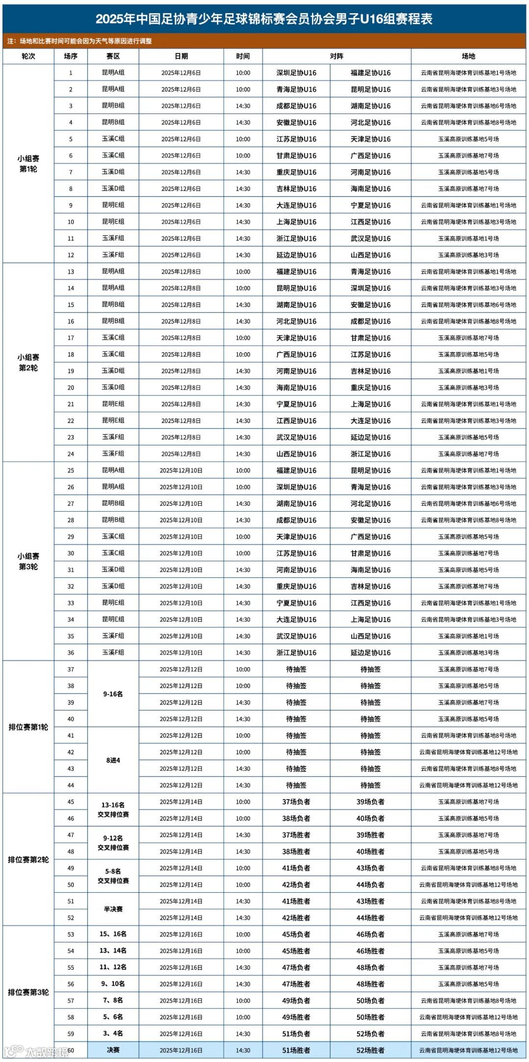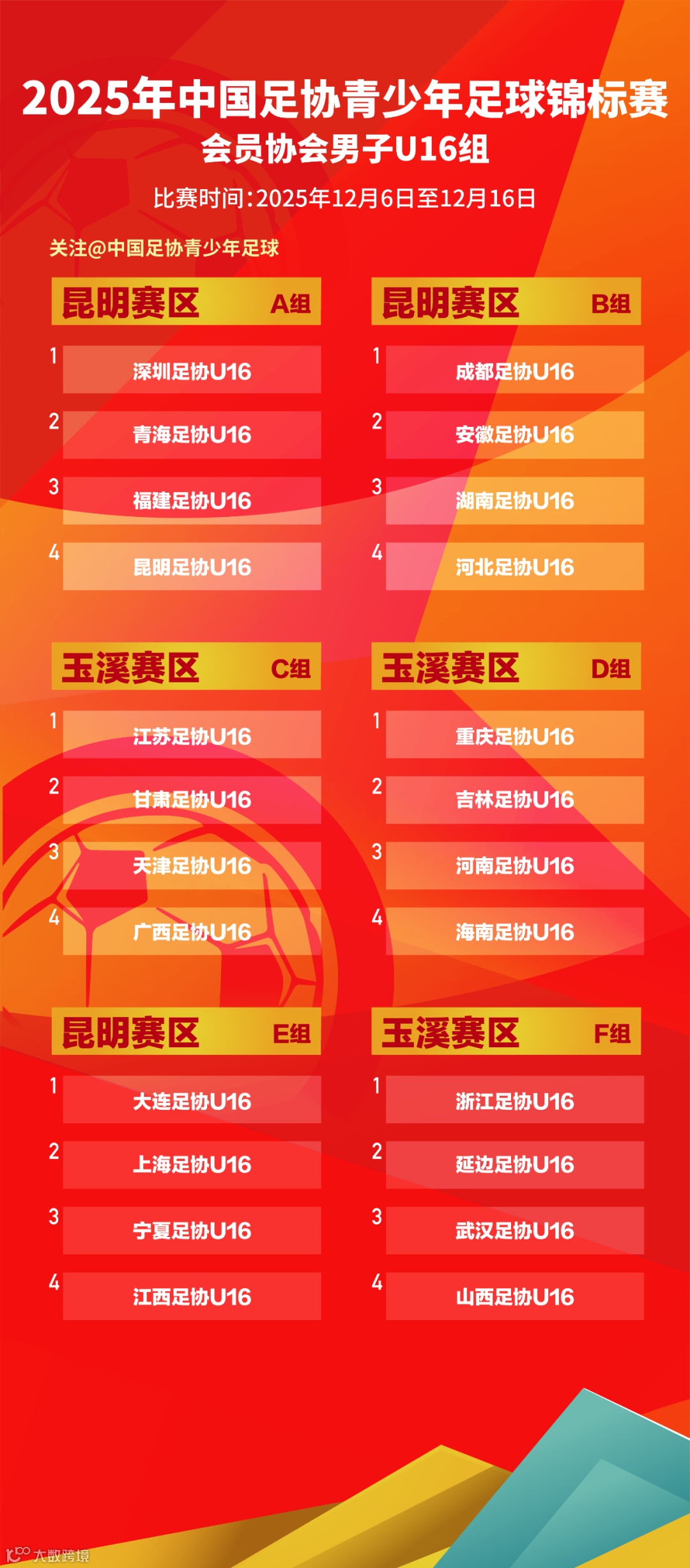 2025年中国足协青少年足球锦标赛会员协会男子U16组的分组和赛程表如下: