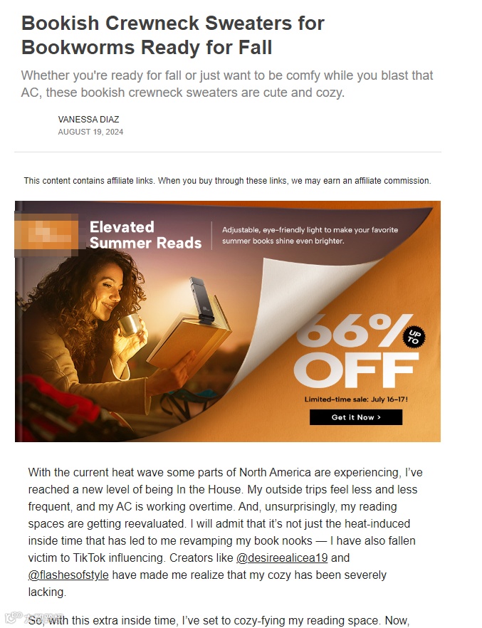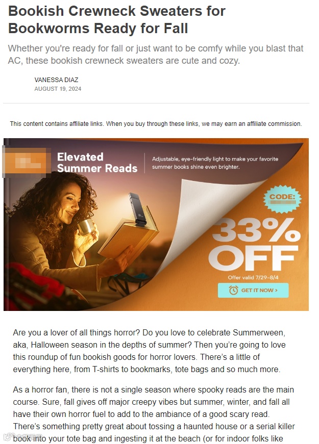 好物推荐2:该篇Newsletter以恐怖小说为主题,盛夏已去,秋风萧瑟时必定是阅读恐怖小说的绝佳时机。编辑向用户描绘了一个未来的梦幻图景,为恐怖小说爱好者推荐了系列书籍周边产品。与第一篇Newsletter不同,该篇文章首页标题下放置了大幅阅读灯海报,附带折扣码,将推广稿件的效果拉满。
