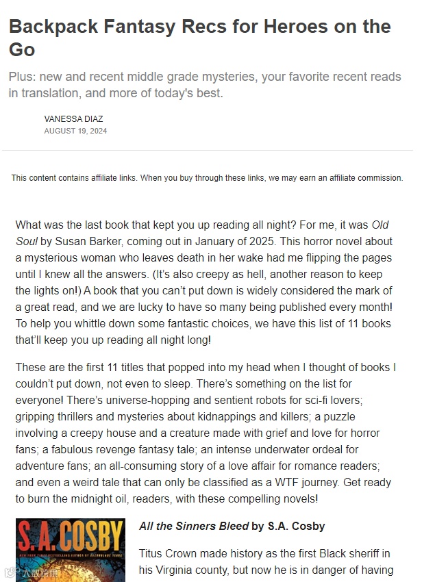 了解到客户需求,小优团队立即查询资源库并结合产品特性,为该品牌提供了投放垂类博客网站-BookRiot的发稿方案。经过联系编辑-撰稿等一系列流程后,在2个月内共成功上线4篇稿件,为产品带来了不小的曝光度。